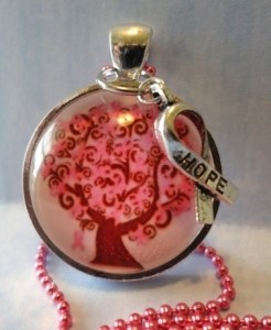 (19) This beautiful Tree Of Life Breast Cancer Awareness Glass Tile Pendant ($11.95, sold out) is a 1 inch round glass cab set in a beautiful silver bezel with a hope ribbon charm dangling from the top. It hangs from a petite pink ball chain that is 24 inches long and can be made shorter upon request. This lovely necklace is made by Mother and Daughter Artists from Pendant Paradise.