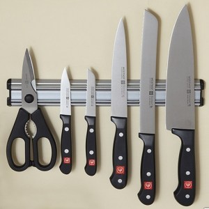 (2) The Wusthof Gourmet 6-Piece Knife Set with Magnetic Knife Holder (sold out) is made with the high quality that Wusthof is known for; triple-riveted for durability and features ergonomic contoured handles to provide a comfortable, nonslip grip. This magnetic knife holder comes in chrome, wood, and black accent colors.